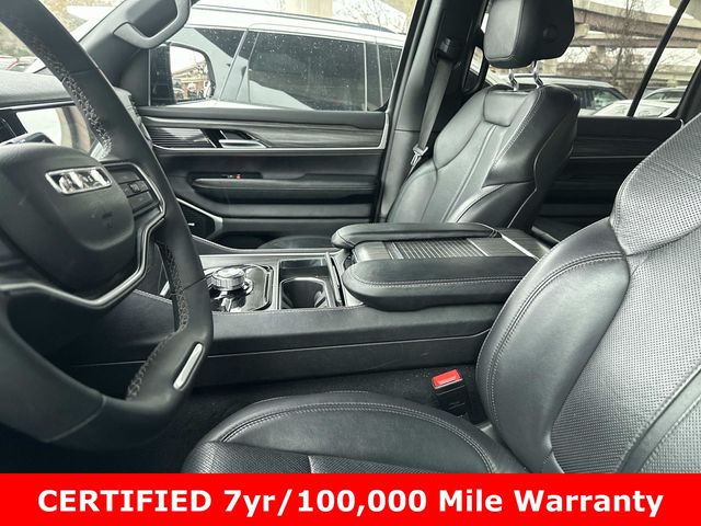 10 Speakers, 118 MPH Maximum Speed Calibration, 3.55 Rear Axle Ratio, 3rd row seats: bench, 4-Wheel Disc Brakes, 8-Passenger Seating, ABS brakes, Adjustable pedals, Air Conditioning, Alloy wheels, AM/FM radio: SiriusXM with 360L, Anti-whiplash front head restraints, Apple CarPlay/Android Auto, Audio memory, Auto-dimming door mirrors, Auto-dimming Rear-View mirror, Auto-leveling suspension, Automatic temperature control, Brake assist, Bumpers: body-color, Compass, Cruise control, Delay-off headlights, Driver door bin, Driver vanity mirror, Driver's Seat Mounted Armrest, Dual front impact airbags, Dual front side impact airbags, Electronic Stability Control, Emergency communication system: Wagoneer Connect, Exterior Parking Camera Rear, Four wheel independent suspension, Front anti-roll bar, Front Bucket Seats, Front Center Armrest w/Storage, Front dual zone A/C, Front fog lights, Front reading lights, Fully automatic headlights, Garage door transmitter, Genuine wood console insert, Genuine wood dashboard insert, Genuine wood door panel insert, Heated door mirrors, Heated front seats, Heated rear seats, Heated steering wheel, Illuminated entry, Knee airbag, Leather Trimmed Bucket Seats, Low tire pressure warning, Memory seat, Navigation System, Normal Duty Suspension, Occupant sensing airbag, Outside temperature display, Overhead airbag, Overhead console, Panic alarm, Passenger door bin, Passenger seat mounted armrest, Passenger vanity mirror, Pedal memory, Power adjustable front head restraints, Power door mirrors, Power driver seat, Power Liftgate, Power passenger seat, Power steering, Power windows, Quick Order Package 25J, Radio data system, Radio: Uconnect 5 Nav w/10.1" Display, Rain sensing wipers, Rear air conditioning, Rear anti-roll bar, Rear dual zone A/C, Rear reading lights, Rear seat center armrest, Rear window defroster, Rear window wiper, Reclining 3rd row seat, Remote keyless entry, Security system, Speed-sensing steering, Speed-Sensitive Wipers, Split folding rear seat, Steering wheel memory, Steering wheel mounted audio controls, Tachometer, Telescoping steering wheel, Tilt steering wheel, Traction control, Trip computer, Turn signal indicator mirrors, Variably intermittent wipers, Ventilated front seats, Voltmeter, Wheels: 20" x 9.0" Premium 2 Aluminum.